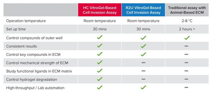 无需冰上操作,在室温下完成实验。基于 VitroGel 的细胞侵袭检测试剂盒即用型。不需要交联剂。