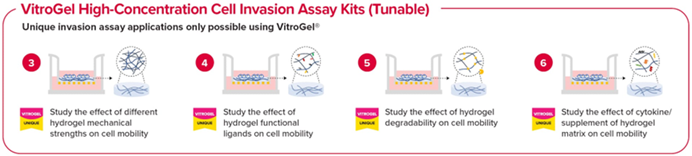 任何可调节的 VitroGel 高浓度细胞侵袭试剂盒,其生物物理和生化特性均可调节,使研究人员能够探索不同的基质强度、配体、趋化因子、生长因子等如何影响细胞侵袭。