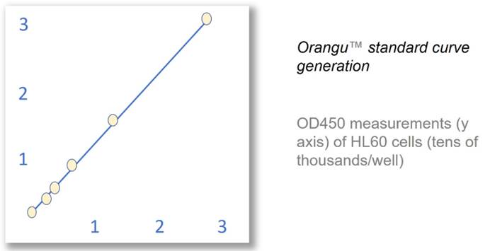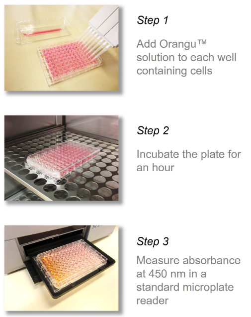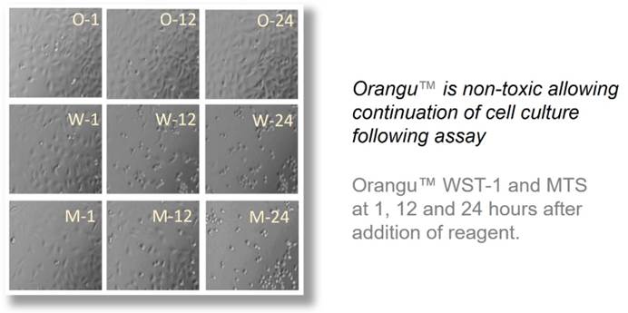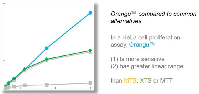 Orangu™ 应用 WST-8在细胞中代谢后会生成橙色的甲臜染料。染料的生成量与活细胞数量成正比。增加孵育时间或细胞数量会导致橙色染料的生成量增加。WST-8是一种易溶于水的四唑盐,在电子载体存在下,该物质被还原为橙色的甲臜染料。细胞内的线粒体脱氢酶充当电子载体,因此生成的甲臜染料的量与活细胞数量和孵育时间成正比。