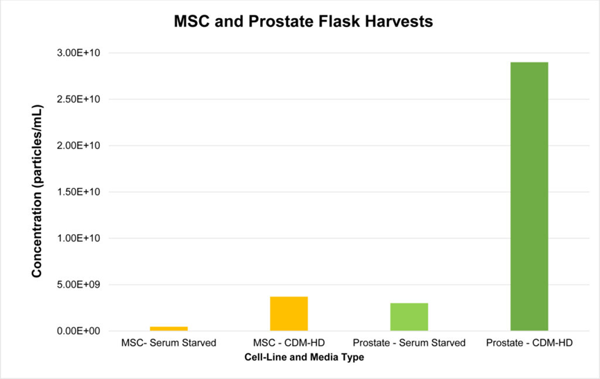 收获物取自T175 培养瓶,含量约为 2.5×106每个培养瓶中的总细胞数。血清饥饿的培养瓶在 10% FBS + DMEM 中生长,并在采集前将血清饥饿 48 小时。将 CDM-HD 培养基培养瓶在 10% FBS+DMEM 中生长,并在采集前 48 小时改用 10% CDM-HD+DMEM。每个培养瓶含有 35 mL 培养基。颗粒浓度如下(颗粒/mL):MSC-血清饥饿 (4.6×108)、MSC-CDM-HD (3.7×109)、前列腺血清饥饿 (3.0×109、前列腺 CDM-HD (2.9×1010).